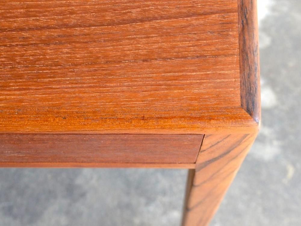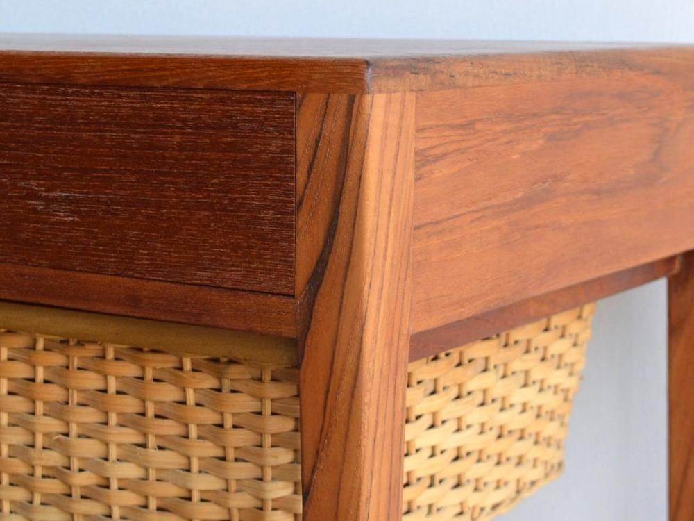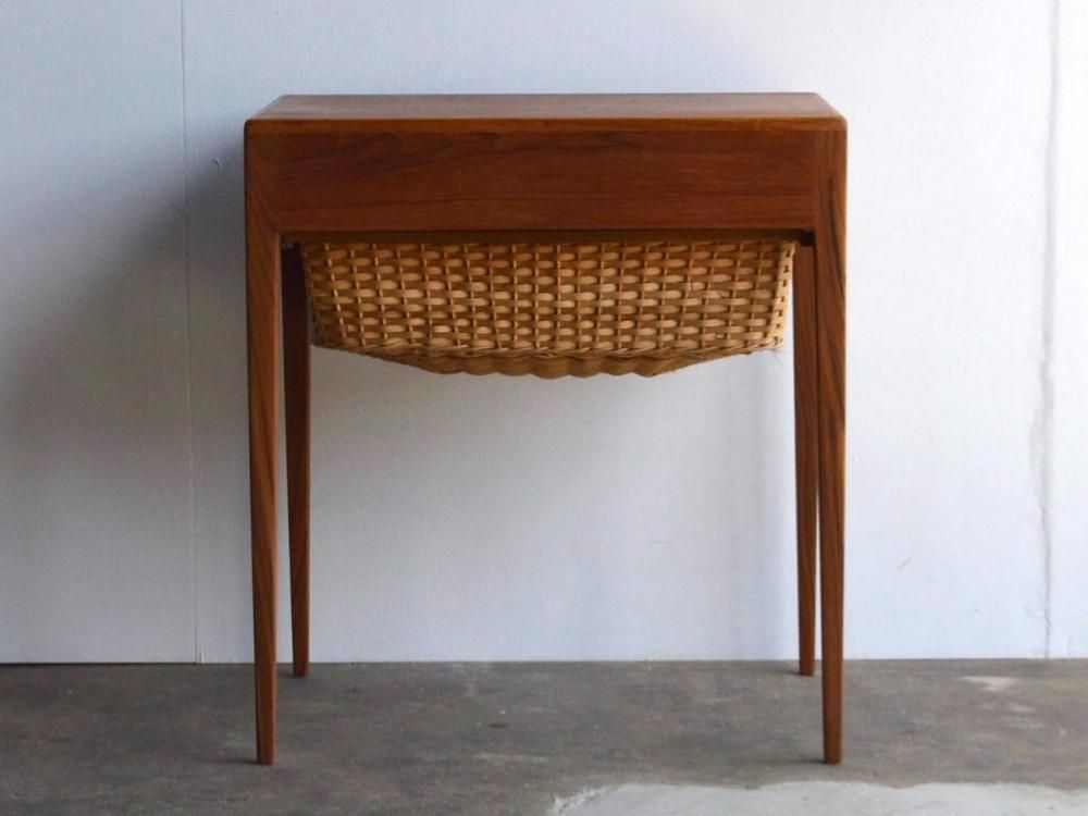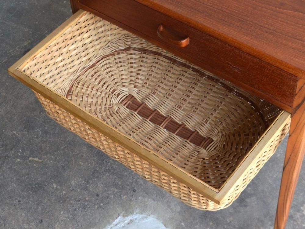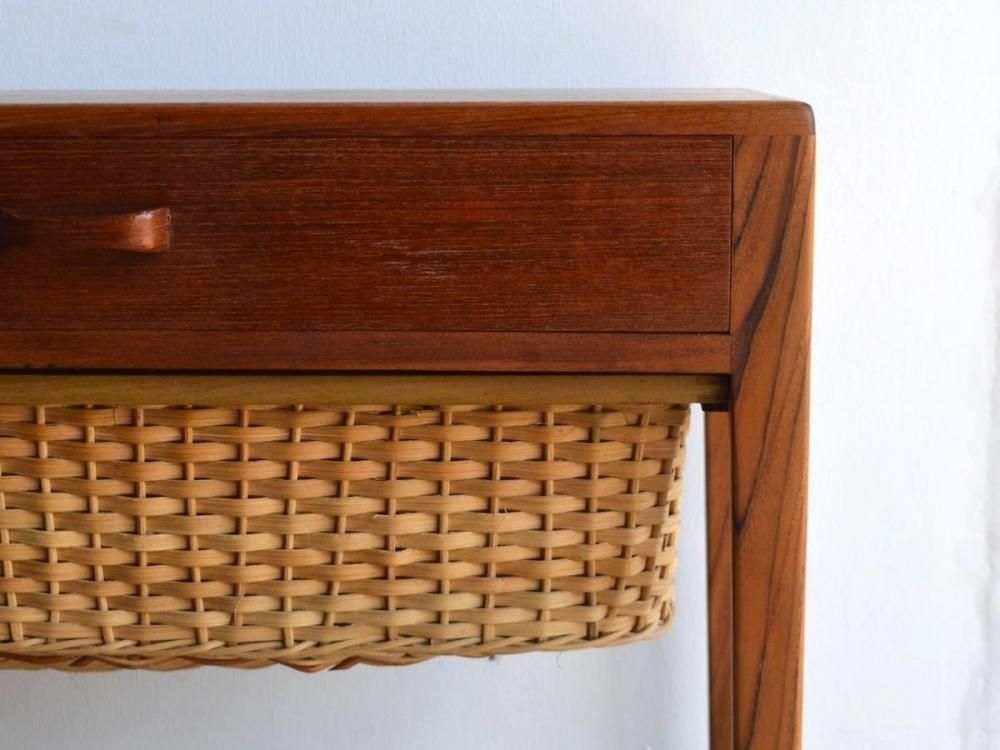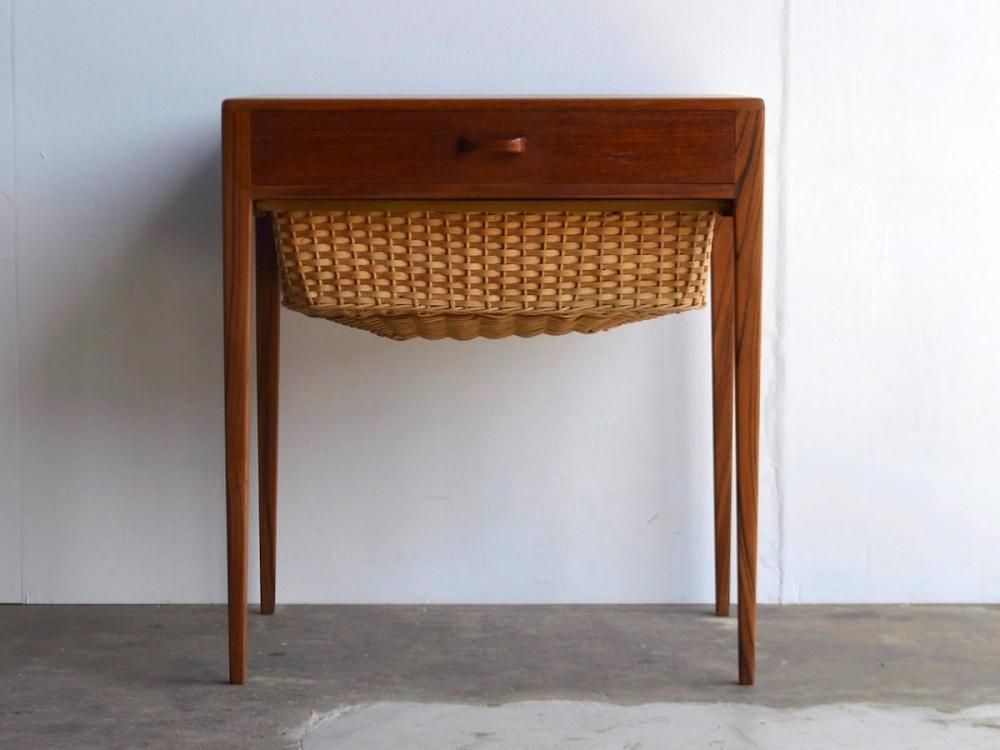 ミッドセンチュリー期にデンマークで製造された、ビンテージのソーイングテーブルです。素材はチーク材になります。引き出し式のラタンのカゴつきです。古い物ですので細かな使用感がありますが、サンディング、クリーニング、無添加オイル、蜜蝋ワックス仕上げ済みです。詳細画像でご確認ください。送料は全国一律2000円です(沖縄、離島は別途送料がかかります)。店頭にてご覧になりたい場合は事前にメール、もしくはお電話にてご連絡ください。(tramt-0011)