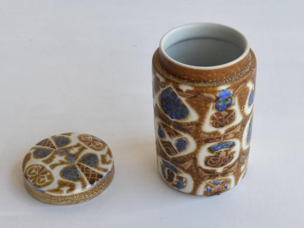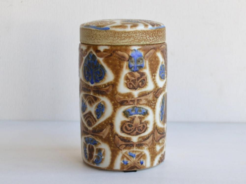 1960年代にRoyal Copenhagen社で製造されたNils Thorssonデザインによる蓋つきのキャニスターです。割れや欠けなどなく良好なビンテージコンディションです。店頭にてご覧になりたい場合は事前にメール、もしくはお電話にてご連絡ください。(trampd-0035)