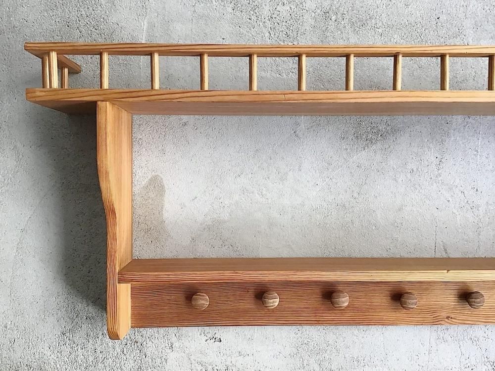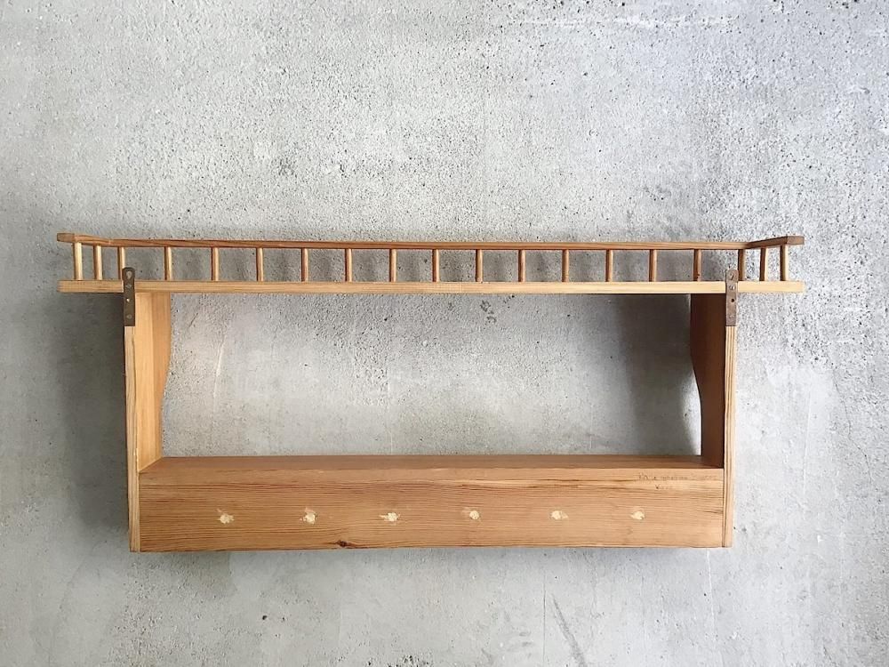 ミッドセンチュリー期にスウェーデンで製造された棚とフック付きのウォールシェルフです。素材はパイン材です。古い物ですので細かな使用感がありますが、クリーニング、無添加オイル、蜜蝋ワックス仕上げ済みです。詳細画像でご確認ください。送料は無料です。店頭にてご覧になりたい場合は事前にメール、もしくはお電話にてご連絡ください。(tramt-0062)