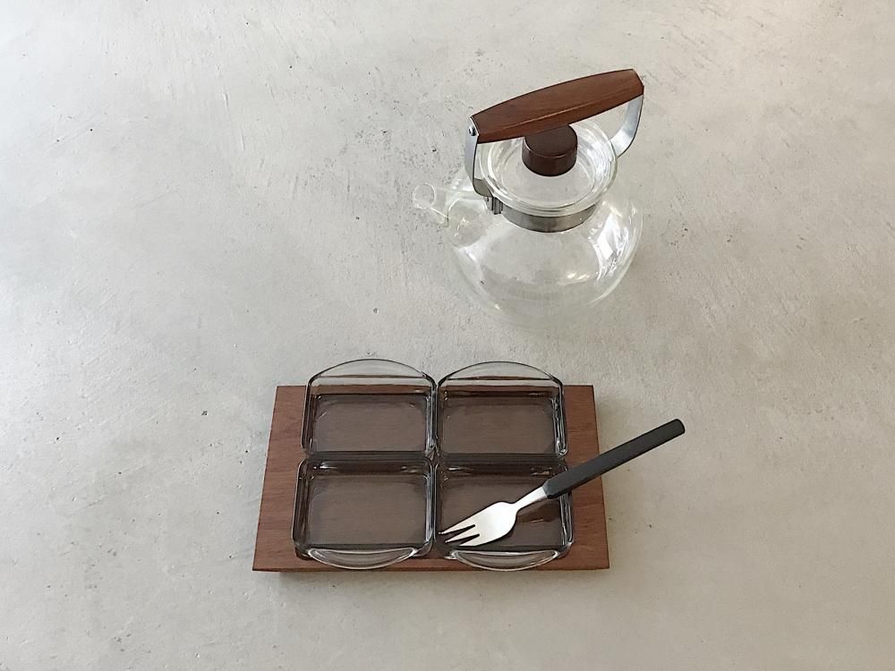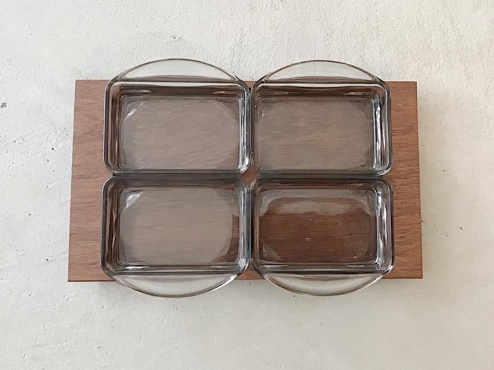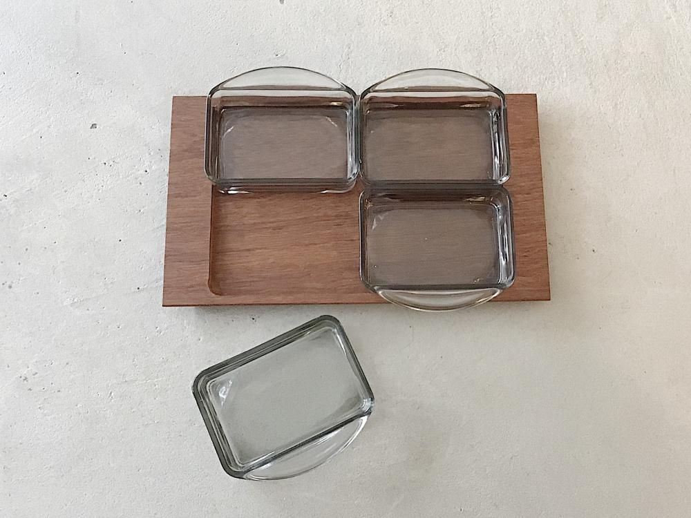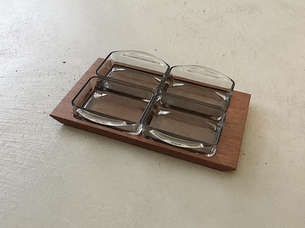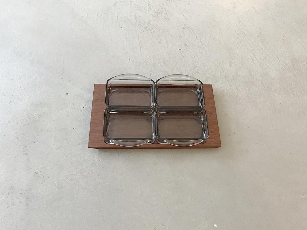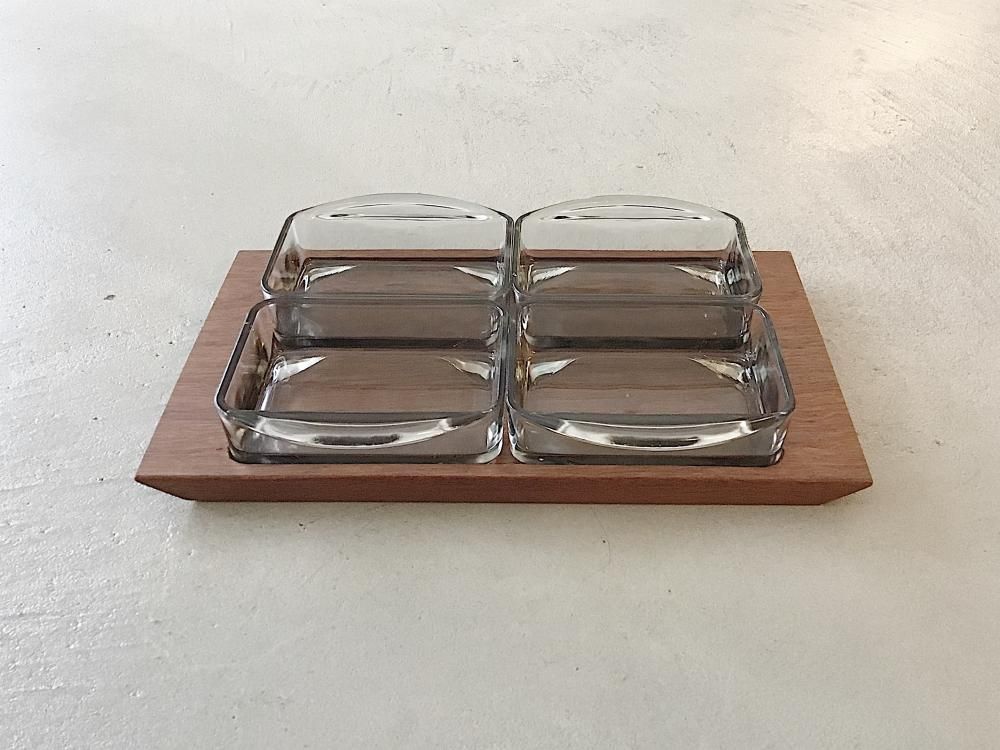 デンマークで製造されたヴィンテージのオードブルトレイです。ガラスのケースが4つ付いています。トレイはチーク材です。古いものですので多少の使用感はありますが割れ欠けなく比較的良い状態です。。店頭にてご覧になりたい場合は事前にメール、もしくはお電話にてご連絡ください。(tramkw-0206)